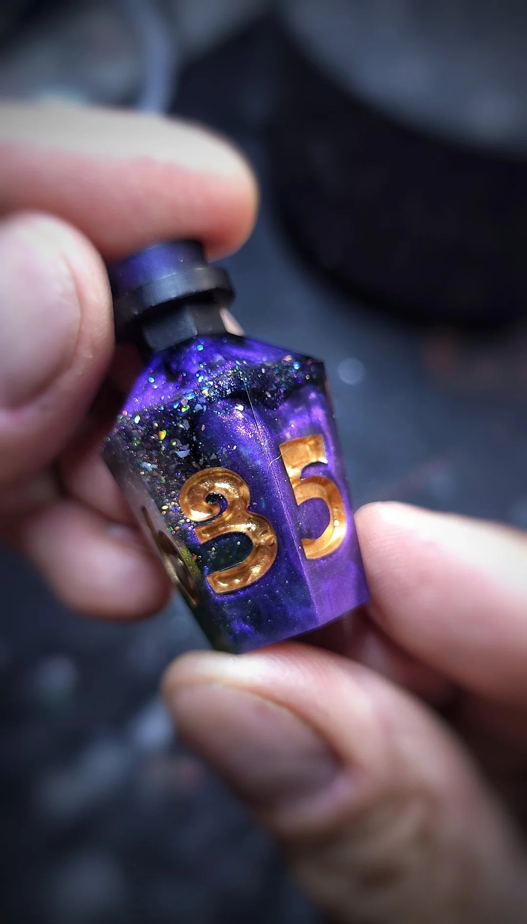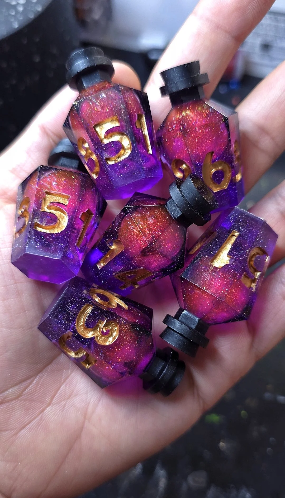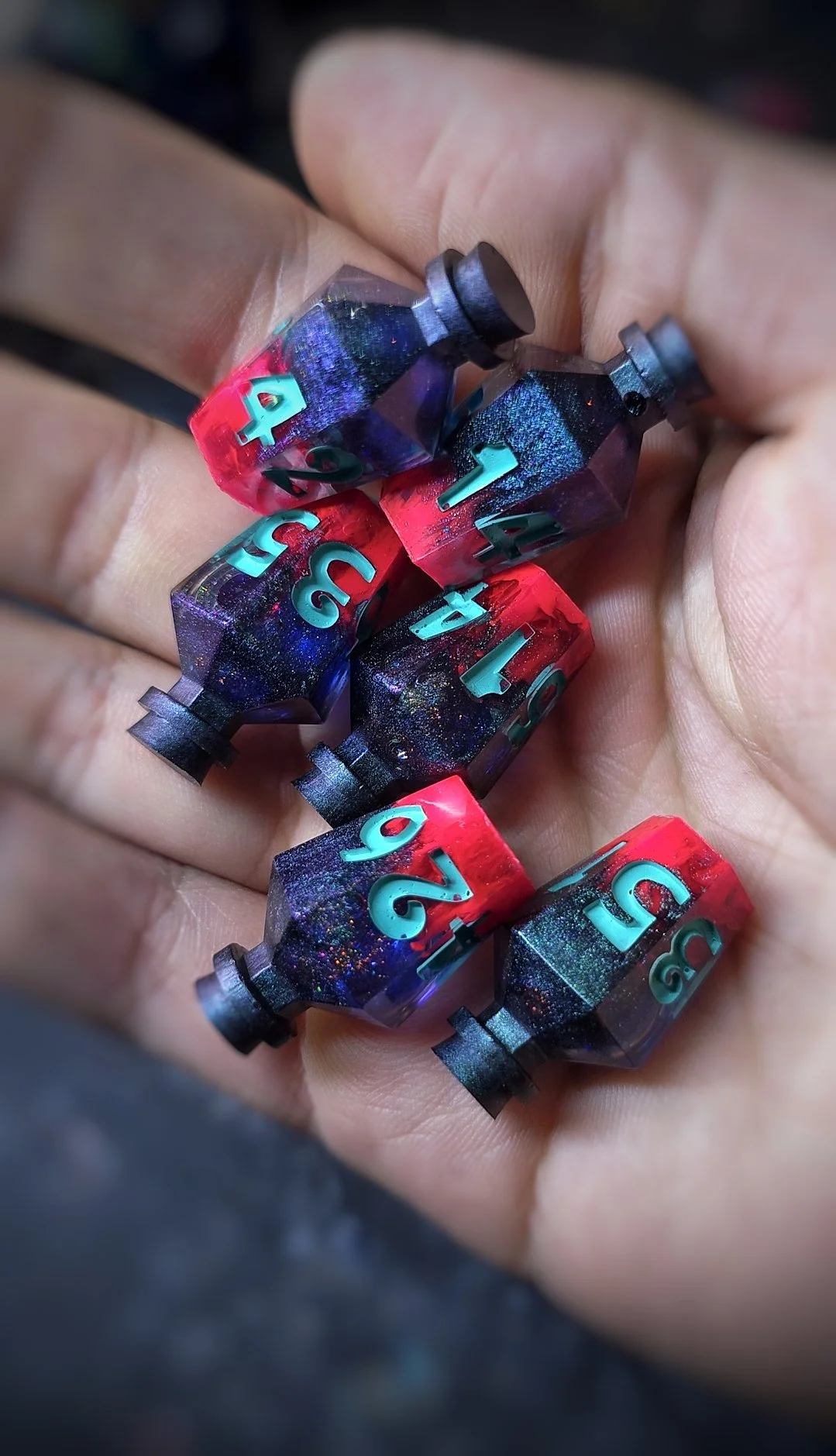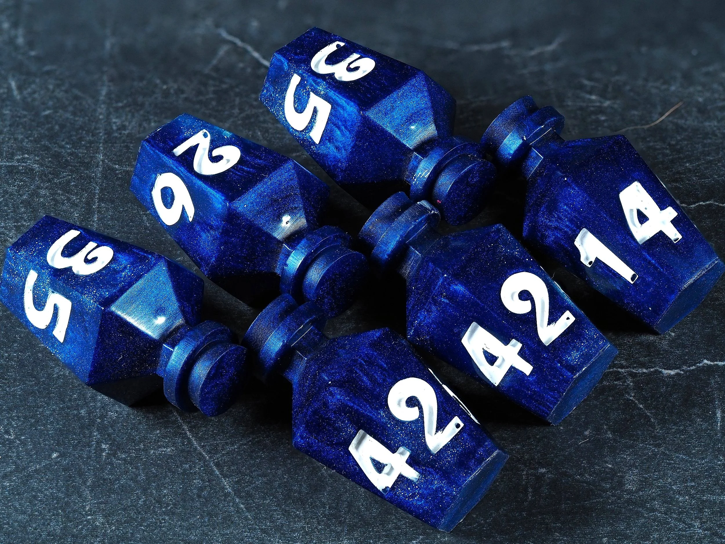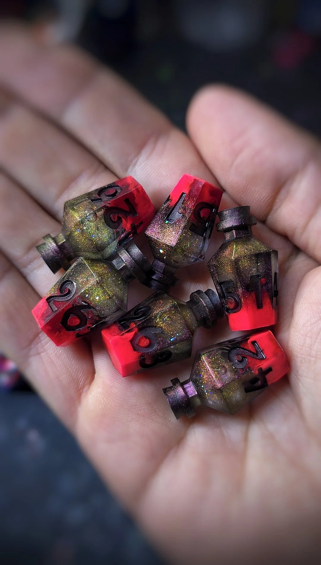 These dice are completely handmade from start to finish. My master dice and molds are also made by myself. Each individual set is unique and takes several hours to complete. Quality comes first when preparing the Sets for their new home, So that your dice are noticed from across the room.