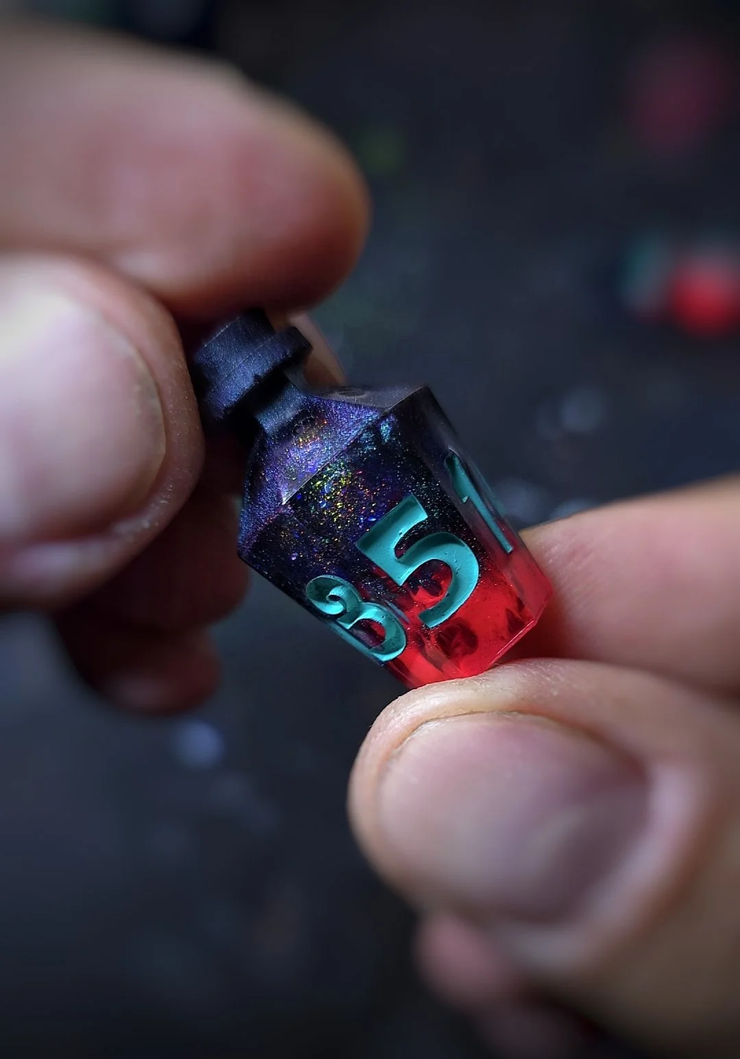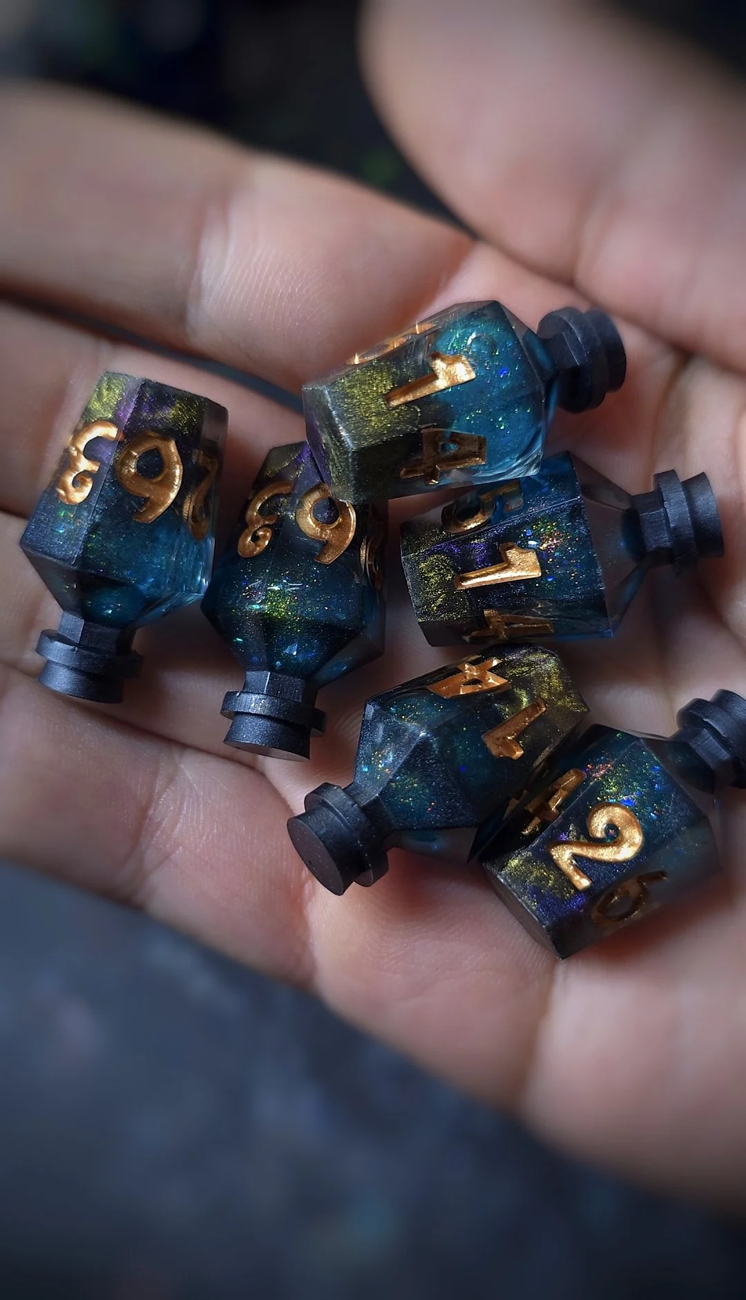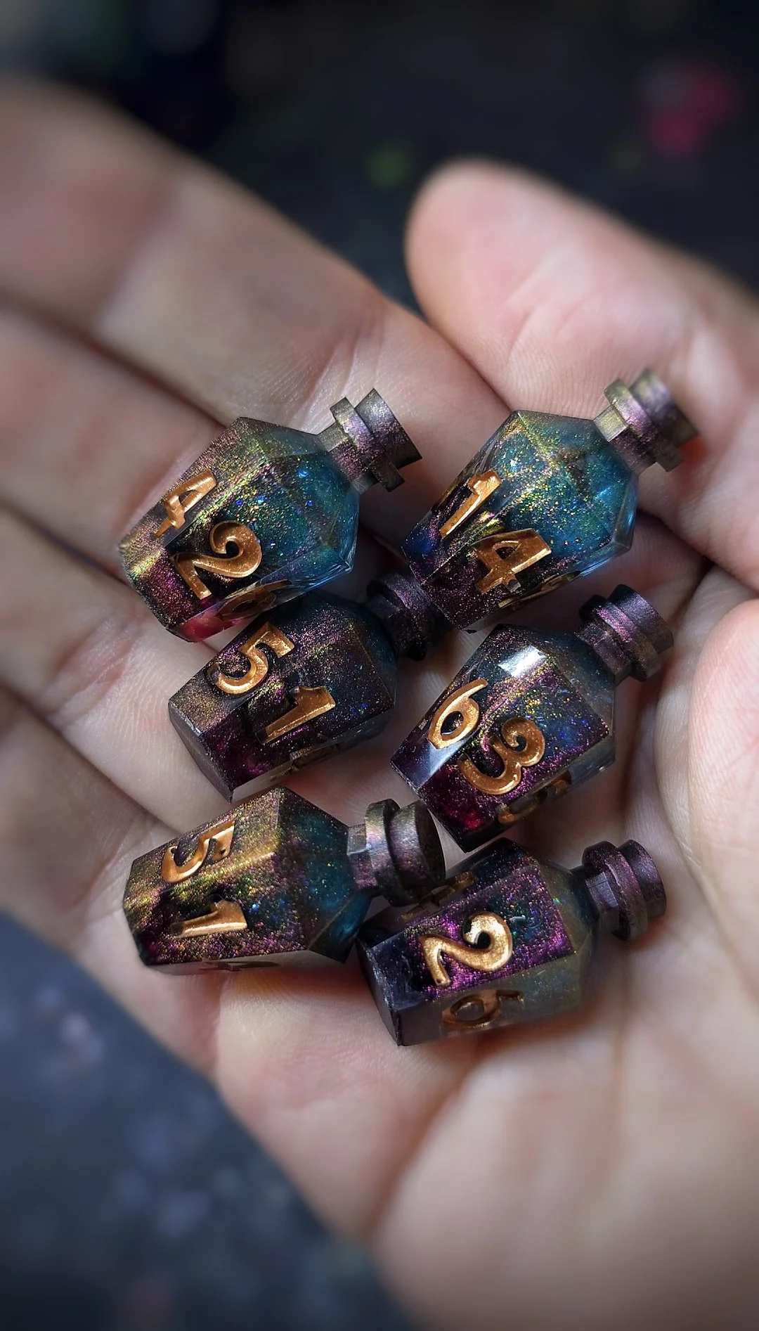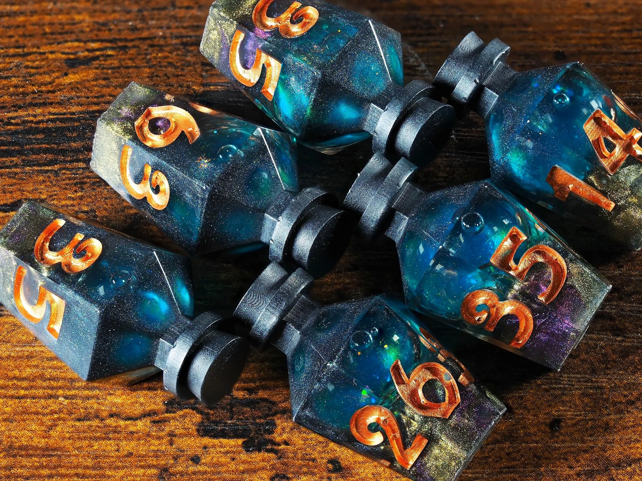 These dice are completely handmade from start to finish. My master dice and molds are also made by myself. Each individual set is unique and takes several hours to complete. Quality comes first when preparing the Sets for their new home, So that your dice are noticed from across the room.