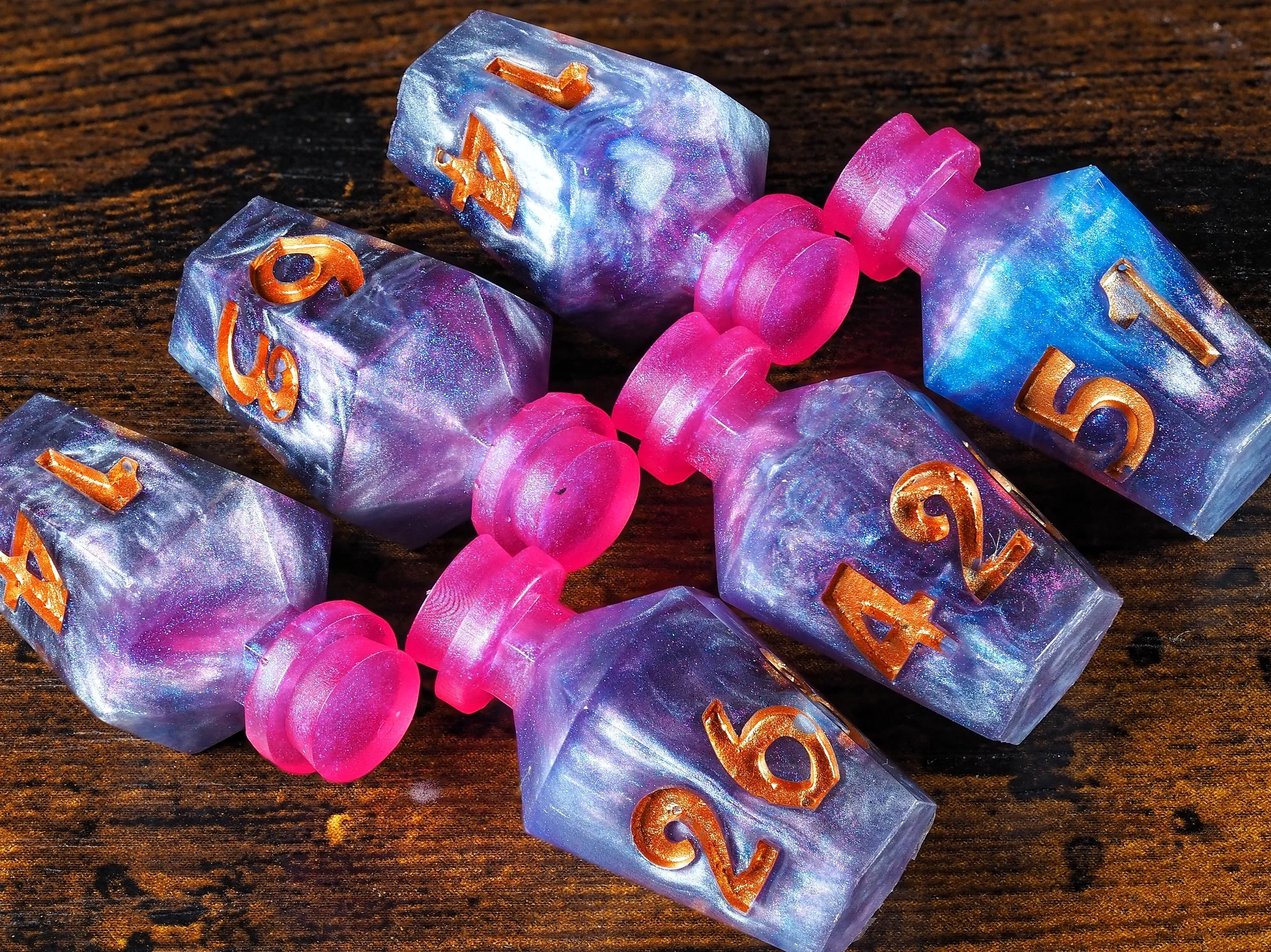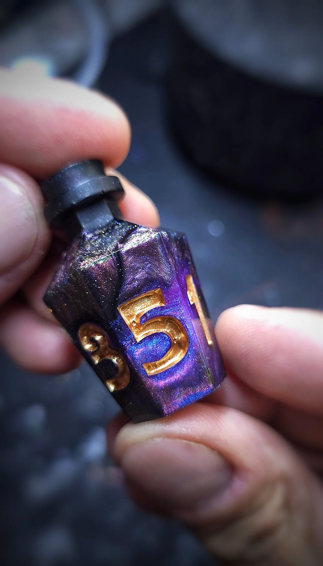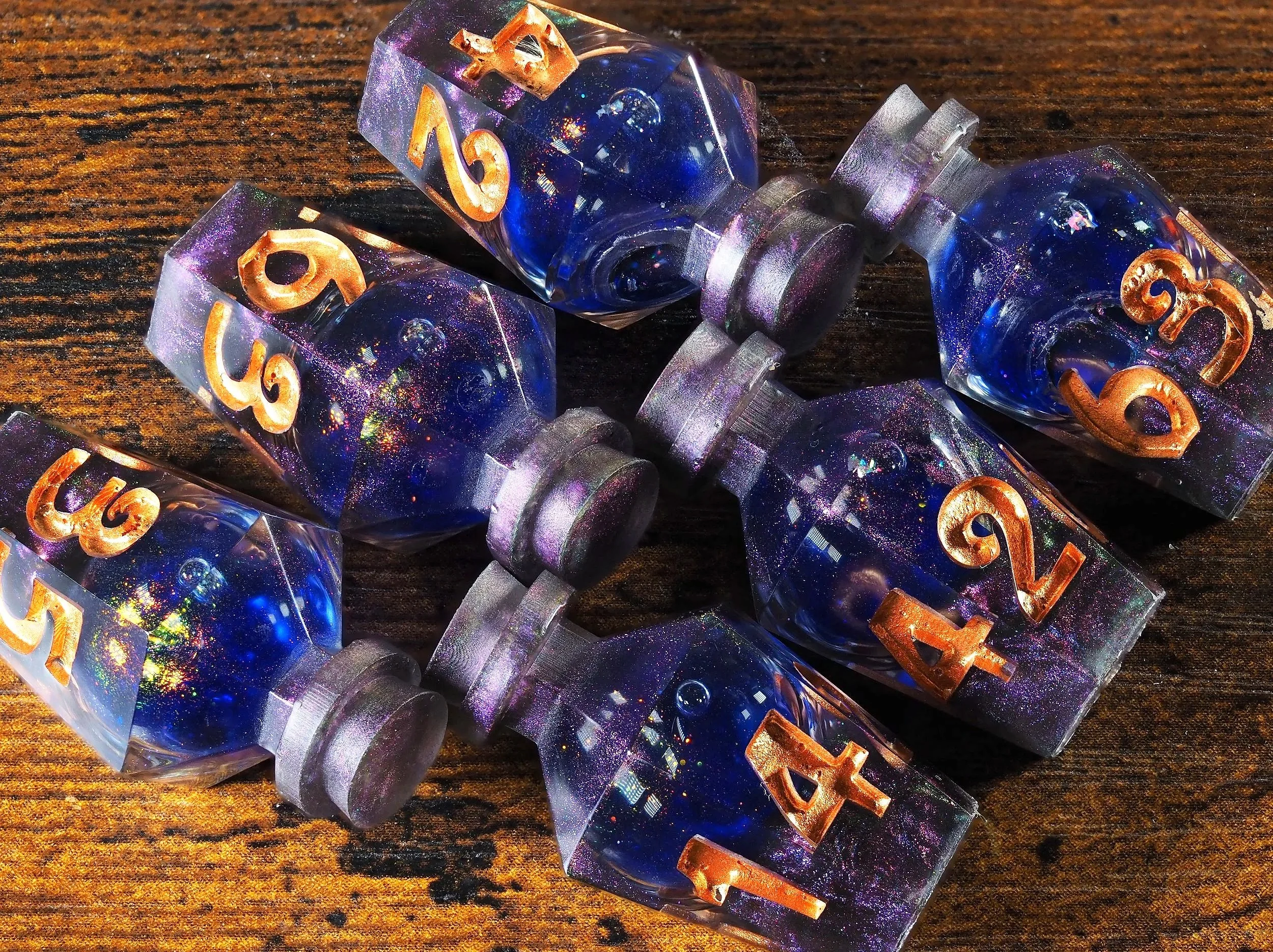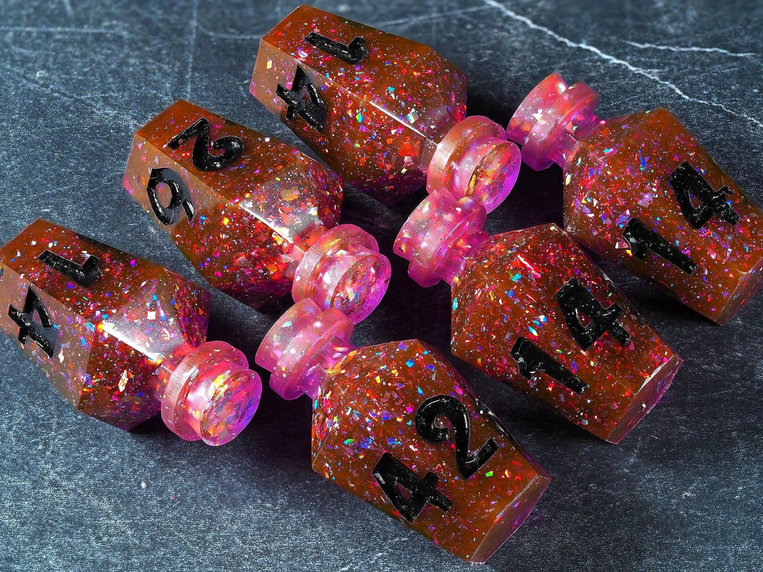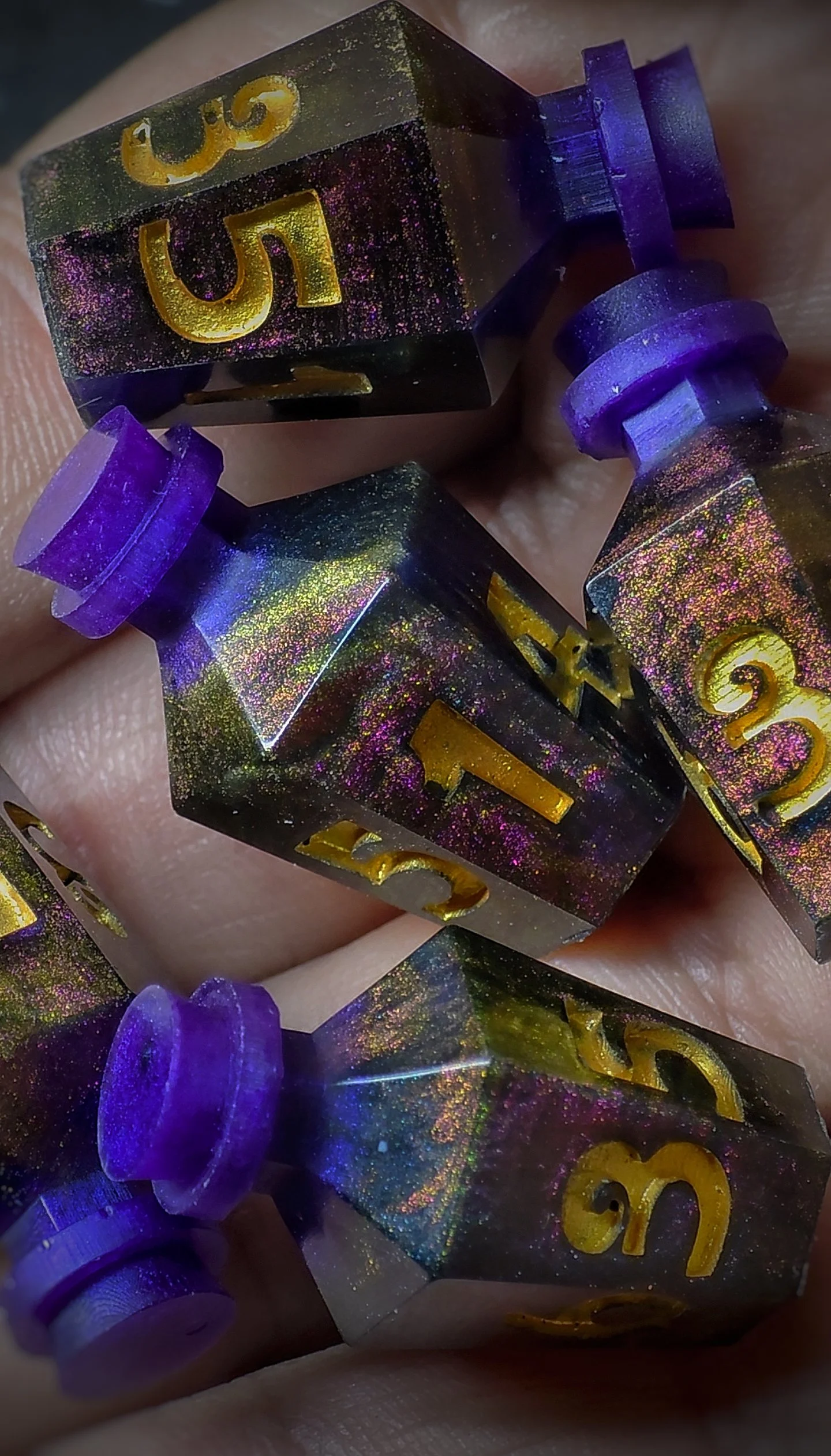 These dice are completely handmade from start to finish. My master dice and molds are also made by myself. Each individual set is unique and takes several hours to complete. Quality comes first when preparing the Sets for their new home, So that your dice are noticed from across the room.