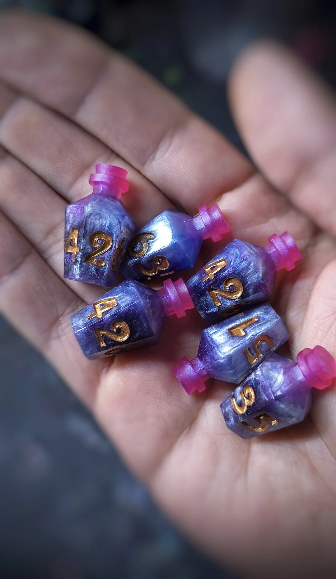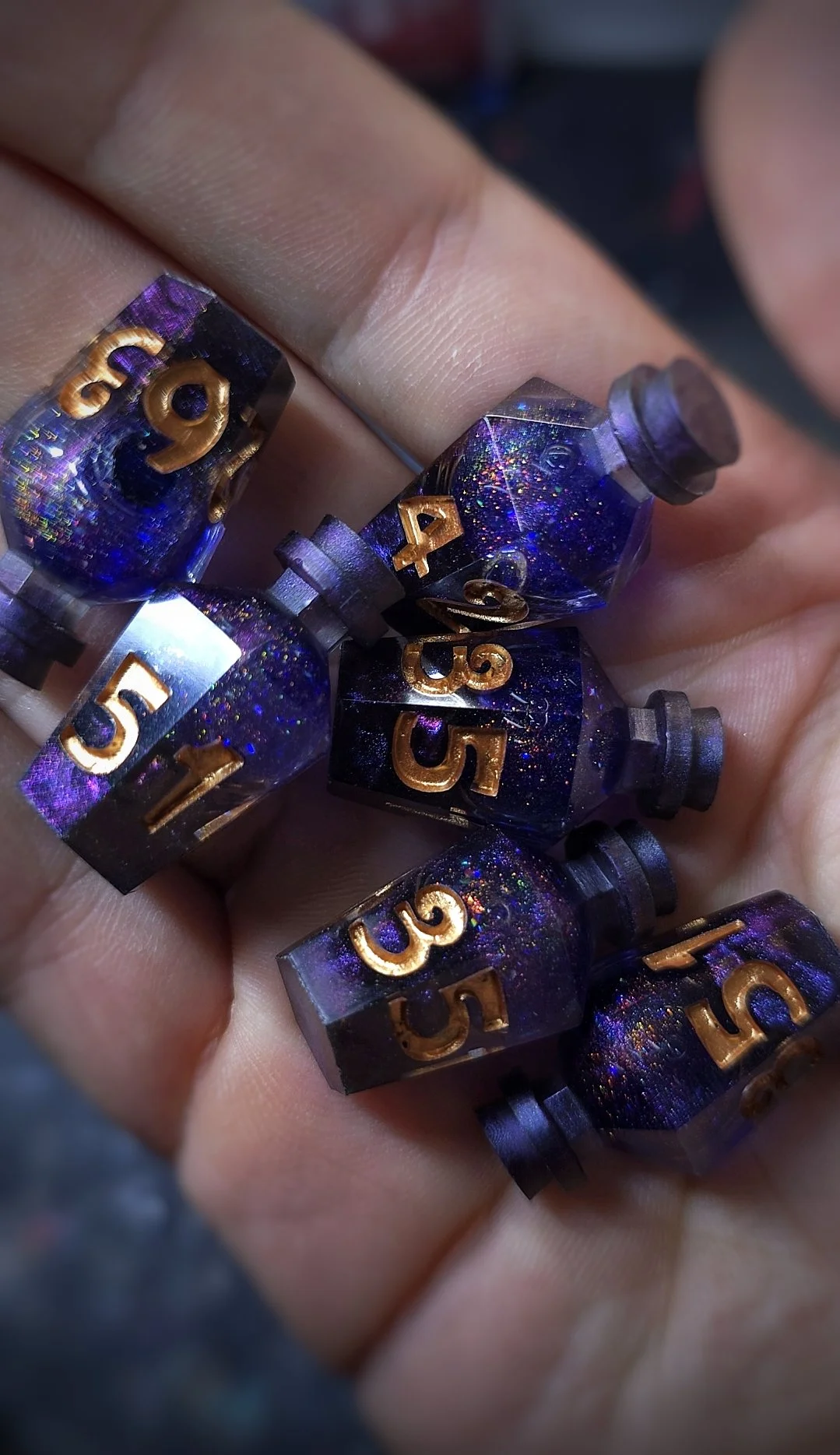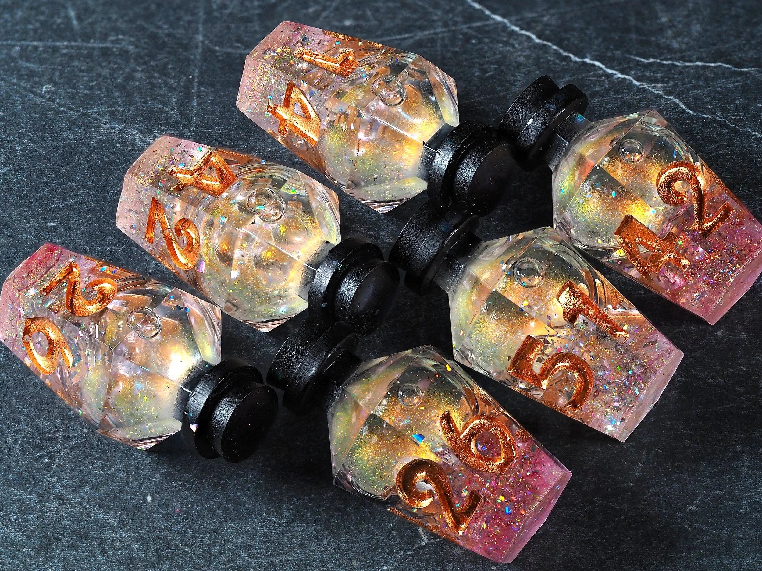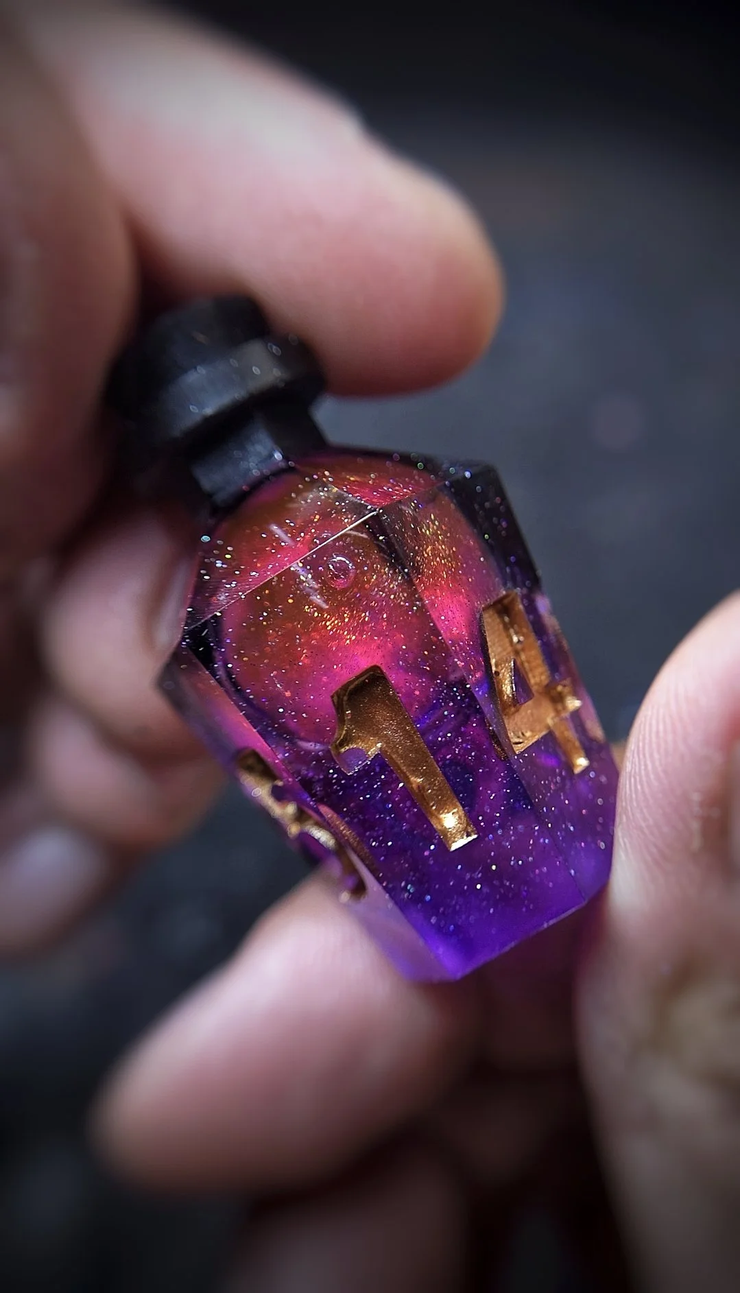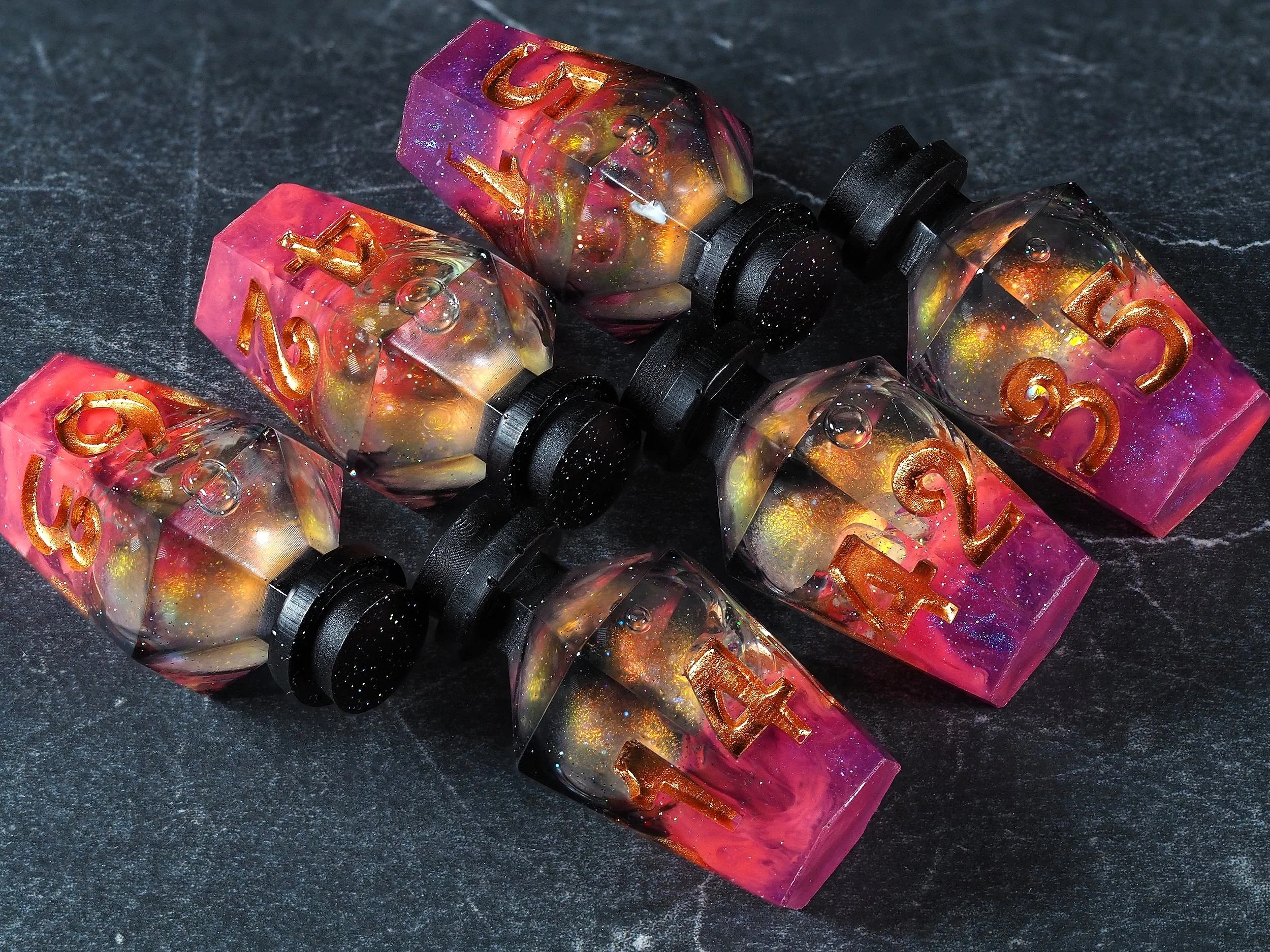These dice are completely handmade from start to finish. My master dice and molds are also made by myself. Each individual set is unique and takes several hours to complete. Quality comes first when preparing the Sets for their new home, So that your dice are noticed from across the room.